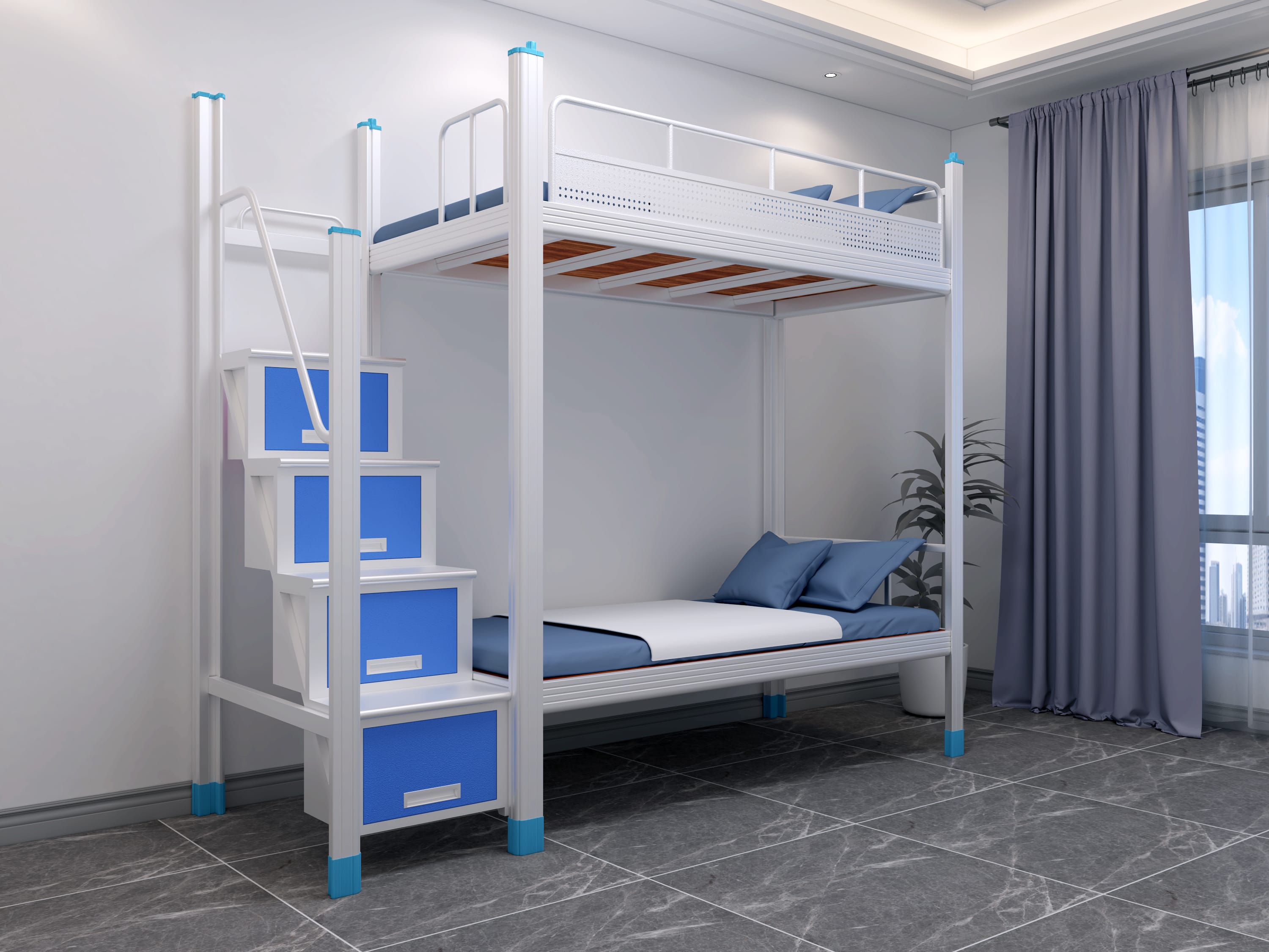 高度:宿舍大概在2.5米至3米之間,所以上下鐵鋪床高度一定要注意,宿舍床過高,上鋪員工睡覺或者活動時容易碰到天花板,過低時在下鋪拿東西會直立不起腰或者直接撞到梁上,普通設計高度為1800mm就可以了。